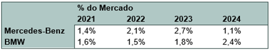 O mercado de elétricos cresceu 165% nos últimos três anos. As vendas da BMW, 303%, da Mercedes, 106%. Enquanto uma têm desempenhado acima do mercado, a outra, abaixo. Nesta tabela, a participação de mercado de cada uma nos últimos três anos: